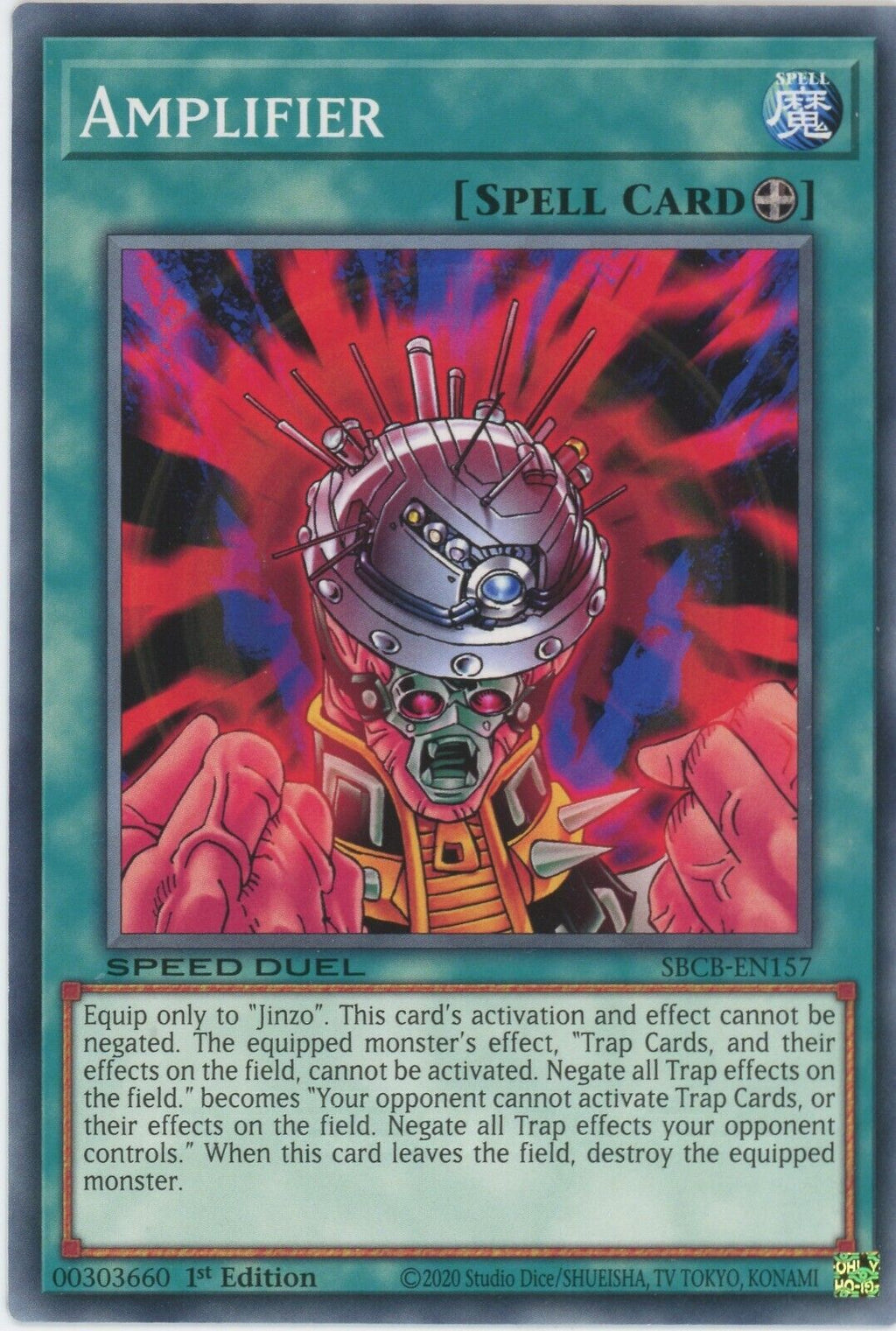 Equip only to "Jinzo". This card's activation and effect cannot be negated. The equipped monster's effect, "Trap Cards, and their effects on the field, cannot be activated. Negate all Trap effects on the field." becomes "Your opponent cannot activate Trap Cards, or their effects on the field. Negate all Trap effects your opponent controls." When this card leaves the field, destroy the equipped monster.