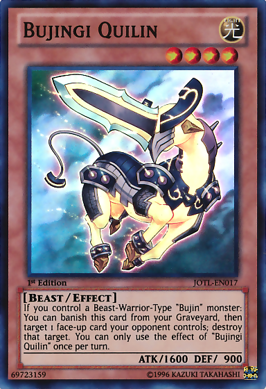 If you control a Beast-Warrior-Type "Bujin" monster: You can banish this card from your Graveyard, then target 1 face-up card your opponent controls; destroy that target. You can only use the effect of "Bujingi Quilin" once per turn.